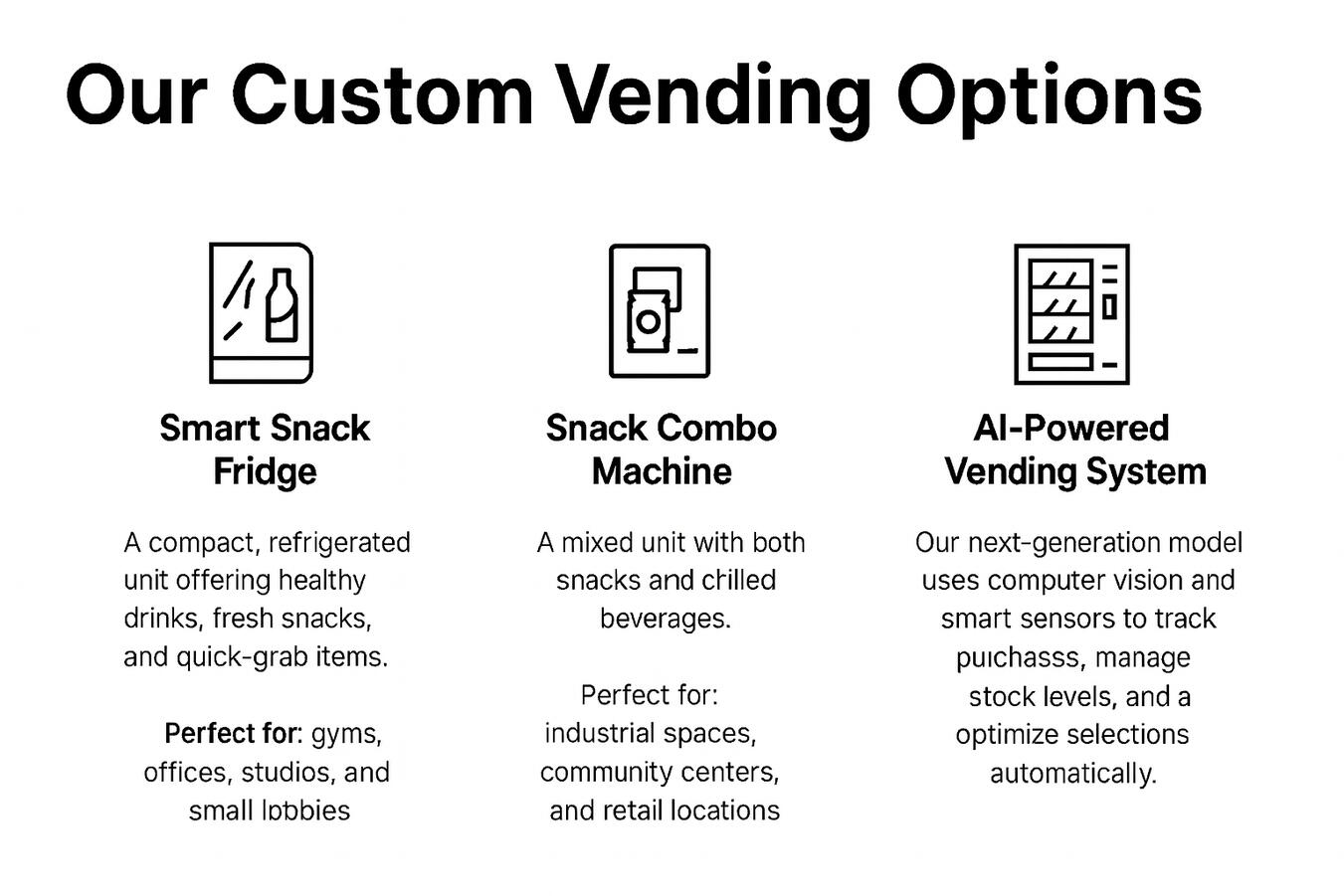 Zero Setup Costs We handle everything from install to maintenance.Healthy Options Curated snacks and drinks for your space.Smart Payments Tap, Apple Pay, or card.Weekly Restocks Always stocked, always clean.